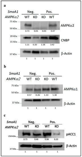 Loss of AMPKα2 results in lower level of expression of the CNBP and pACC1 proteins in both physiological (SmoA1−) and pathophysiological (SmoA1+) contexts. Western blot analyses of the AMPKα2 (a), AMPKα1 (b), CNBP (a), pACC1 (c), and β-Actin proteins in whole cerebellum protein extracts obtained from WT, AMPKα2−/−, [GFAP-tTA;TRE-SmoA1; AMPKα2−/−], and [GFAP-tTA;TRE-SmoA1] Postnatal Day 16 (P16) littermate mice. Below each Western blot band, we show the ratio of the band intensity of the targeted protein over the band intensity of β-Actin.