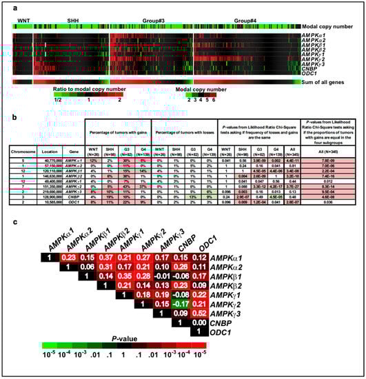 Frequent copy number gains for the AMPK, CNBP, and ODC1 genes in SHH and Group #3 medulloblastoma patients. (a) Estimated ratio of copy number to modal copy number for each tumor for 345 medulloblastomas, including 26 WNT, 98 SHH, 82 Group #3, and 139 Group #4 samples. Modal copy number estimates are shown in the first row and the rows for individual genes show copy number estimates normalized to the modal copy number. The “sum of all genes” row was computed from the sum of the log-transformed ratios for the nine genes and was used to determine the sorting of samples in each group. (b) The percentage of tumors within each of the four subgroups with copy number gains [log2() > 0.4] or losses [log2() < −0.4]. Gains or losses in greater than 5% of the tumors in a given group are highlighted with red or green background, respectively. Similarly, p values < 0.01 are highlighted. (c) Analysis of the correlations of log-transformed normalized copy number estimates shows that positive correlations are frequent. Pearson correlations are shown as numbers in white, while their significance is indicated by the color of the background in each cell.