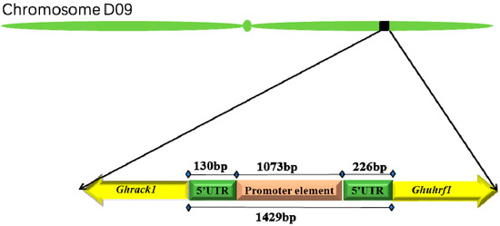 Schematic representation of the organization of the Ghrack1 and Ghuhrf1 genes on chromosome D09 of Gossypium hirsutum. The 1429 bp of the intergenic region and the core 1073 bp promoter are marked. In total, 226 bp and 130 bp 5′-UTRs were upstream of Ghuhrf1 and Ghrack1, respectively.