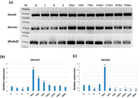 Semiquantitative PCR and qRT-PCR (quantitative real-time PCR) data of the transcript levels of the Ghrack1 and Ghuhrf1 genes in different tissues of Gossypium hirsutum. (a) Semiquantitative PCR survey of various cotton tissues for the detection of Ghrack1 and Ghuhrf1 transcripts. Ghsad1 was used as a control. (b,c) Relative transcript abundance of two Gossypium hirsutum genes, that is, Ghrack1 (a) and Ghuhrf1 (c), detected in various cotton tissues by qRT-PCR. The data represent the relative expression of the Ghrack1 and Ghuhrf1 transcripts ± SD of three biological replicates in each tissue (n = 3). Asterisks and double asterisks indicate significant deviations from the root at p < 0.05 and p < 0.01, respectively, using the Student’s t-test for comparisons between the root and other tissues separately for both genes. R (root), L (leaf), A (anther), S (stigma), 0 dpa (0 dpa fiber), 5 dpa (5 dpa fiber), 7 dpa (7 dpa fiber), 14 dpa (14 dpa fiber), 21 dpa (21 dpa fiber), 26 dpa (26 dpa fiber), and 28 dpa (28 dpa fiber).
