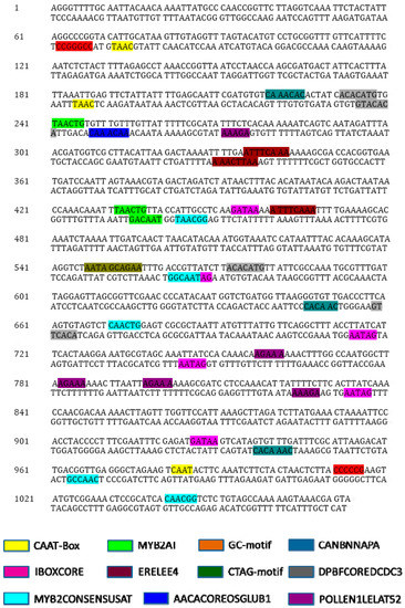 - Lescot, M.; Dehais, P.; Thijs, G.; Marchal, K.; Moreau, Y.; Van de Peer, Y.; Rouze, P.; Rombauts, S. PlantCARE, a database of plant cis-acting regulatory elements and a portal to tools for in silico analysis of promoter sequences. Nucleic Acids Res. 2002, 30, 325–327. [Google Scholar] [CrossRef] [PubMed]