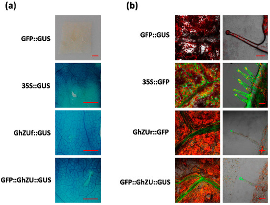 The final plant expression vectors were mobilized into the Agrobacterium tumefaciens strain GV3101 by using the freeze-thaw method. First, we transformed the vector into tobacco for the transient expression experiments. The transformed bacteria were grown on YEB medium containing 50 mg/L kanamycin, 100 mg/L rifampicin at 28 °C, and 220 rpm overnight. The cultures were diluted 1:100 with YEB and allowed to grow to an absorbance (measured at 600 nm) of <0.8. The young leaf epidermis nearest to the top of Nicotiana benthamiana at approximately the 6–8 leaf stage was used for infection with A. tumefaciens. The infection was stopped when at least two-thirds of the target leaf was consumed by A. tumefaciens. After the infection, the plants were cultured at a high humidity for 12 to 16 h in the dark, and then cultured under normal conditions for 3 days. Then, we transformed the vector into Arabidopsis for the stable expression experiments using a standard floral-dipping method [40]. The transformants were selected on MS medium supplemented with 50 mg/L kanamycin. Transgenesis was confirmed via PCR using GhZU-F/R. Transgene homozygotes selected from the T3 generation were used for the analysis of gfp and gus expression.