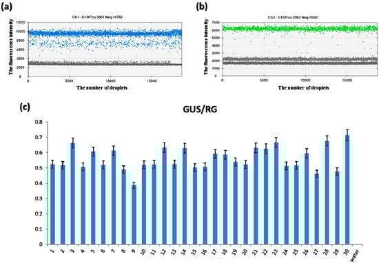 According to the Arabidopsis single-copy gene RG (AT1G03400.1) and the target gene gus, we designed a primer probe for a droplet digital PCR. The amplification results showed that the designed primer probe had high specificity, and the system could clearly distinguish between positive and negative microdrops (Figure 5a,b). The number of microdrops generated in the experiment exceeded 13,000, thus meeting the requirements of the Poisson distribution, and the relative standard deviation (RSD) value of the number of droplets formed by three replicates was less than 0.25, meeting the requirements of EU (European Union) nucleic acid molecular testing. The above results show that the droplet digital PCR system was stable and repeatable, and that the data was reliable [21,22,23,24].
