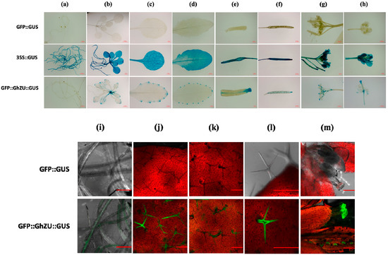 Localization of GUS and GFP in vegetative and reproductive tissues of GFP::GUS, 35S::GUS, and GFP::GhZU::GUS transgenic Arabidopsis plants. (a–h) Histochemical GUS localization data of GFP::GUS (up), 35S::GUS (middle), and GFP::GhZU::GUS (down) in vegetative and reproductive tissues of Arabidopsis plants. (a) Root region; (b) two-week-old Arabidopsis seedlings; (c) young leaf; (d) old leaf; (e) developing silique; (f) mature silique; (g) inflorescence; and (h) flower. Histochemical GUS images of GFP::GUS (up), 35S::GUS (middle), and GFP::GhZU::GUS (down) are shown. (i–m) Confocal laser-scanning microscopic analysis of gfp expression under GFP::GUS and GFP::GhZU::GUS in Arabidopsis plants. (i) Root, (j) young leaf trichomes, (k) old leaf trichomes, (l) trichomes, and (m) flower. Green fluorescence images of GFP::GUS (up) and GFP::GhZU::GUS (down) are shown.