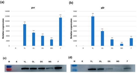 The western blot analysis using an anti-GUS antibody revealed strong GUS expression in the young leaves, older leaves, developing silique, and floral tissues, and moderate expression in the mature silique. However, no detectable GUS protein was visualized in the root (Figure 7c). Using an anti-GFP antibody revealed that GFP expression was highest in the young leaves, and had moderate expression in the old leaves. Whereas the lowest expression was detected in the developing silique and floral tissues, and GFP protein expression was not detected in the root (Figure 7d). The western blot results differed from the results obtained in the fluorescence quantitative analysis, potentially because the total protein from the plants degraded during extraction, or the protein expression was too weak and the sensitivity was too low, making it impossible to detect.
