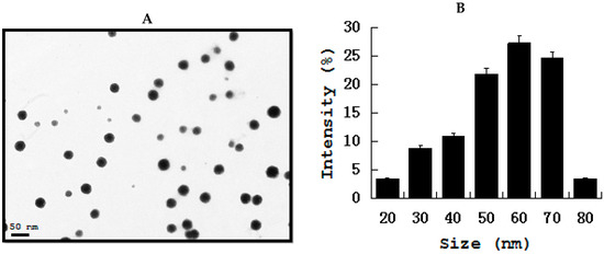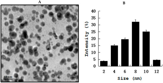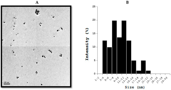 Transmission electron microscopy (TEM) of silver nanoparticles (AgNPs) (A) TEM images of AgNPs synthesized by culture supernatant of Bacillus marisflavi (B). Size distribution of AgNPs from TEM images.