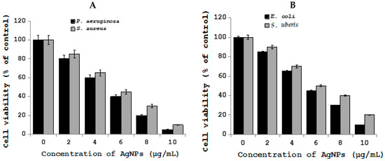 Effect of silver nanoparticles on S. aureus and P. aeruginosa, E. coli, and S. uberis from mastitis-infected goats. (A) Cell viability of S. aureus and P. aeruginosa treated with AgNPs. (B) Cell viability of E. coli, and S. uberis treated with AgNPs. Bacterials cells were incubated with various concentrations of AgNPs. Bacterial survival was determined at 24 h by a CFU (colony forming unit) count assay. The experiment was performed with various controls, including a positive control (AgNPs and NB, without inoculum) and a negative control (NB and inoculum, without AgNPs). The results are expressed as the means ± SD of three separate experiments, each of which contained three replicates. Treated groups showed statistically significant differences from the control group by Student’s t test (p < 0.05).