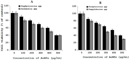 Effect of AuNPs on Staphylococcus spp., Salmonella spp., Streptococcus spp., and Campylobacter spp. in chicken. Staphylococcus spp., Salmonella spp., Streptococcus spp., and Campylobacter spp. cells were incubated with various concentrations of AuNPs. (A) Cell viability of Staphylococcus spp. and Salmonella spp. treated with AuNPs. (B) Cell viability of Streptococcus spp. and Campylobacter spp. treated with AuNPs. Bacterial survival was determined at 24 h by a CFU count assay. The experiment was performed with various controls, including a positive control (AuNPs and NB, without inoculum) and a negative control (NB and inoculum, without AuNPs). The results are expressed as the means ± SD of three separate experiments, each of which contained three replicates. Treated groups showed statistically significant differences from the control group by Student’s t test (p < 0.05).