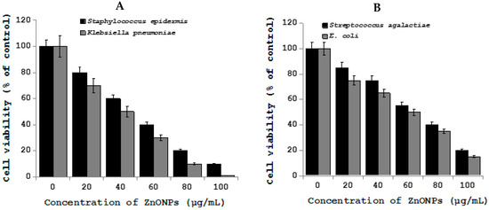 The metal oxide nanoparticles, particularly Zinc oxide nanoparticles are most commonly used in catalysis, sensors, and environmental remediation and personal care products [160]. Recently, ZnO-NPs that were used in various applications of veterinary sciences due to their antibacterial, antineoplastic, wound healing, and angiogenic properties, and further ZnO-NPs have been used in tissue repair, as food preservative and as feed additive. ZnO-NPs found to inhibits the viability wide range of bacteria by strong interaction with bacterial cells and it could induce microbial cell injury by the generation of hydrogen peroxide from the surface of ZnO and finally it can enter into the bacteria by interacting with phosphorus and sulphur containing compounds, like DNA of bacteria [161,162,163,164]. Mastitis is a disease of high yielding animals that is commonly caused by Staphylococcus, Streptococcus, and E. coli, which leads to economic consequences by reducing the yield of milk. To treat various causative agents of mastitis the usage of antibiotics has been increased and eventually leads to antibiotic resistance [165,166]. ZnO-NPs have been found to be effective against biofilm inside the udder tissue causative agents, such as S. aureus and E. coli [167,168]. Arabi et al. found that the bactericidal effects on both Gram-positive and Gram-negative bacteria and also effective against spores that are resistant to high temperature and high pressure by the mechanism of increase the permeability and inhibition of membrane transport and eventually leads to cell death [169,170,171]. To determine the effect of Zinc oxide nanoparticles on various mastitis causing bacteria, including Staphylococcus epidermis, Streptococcus agalactiae, Klebsiella pneumoniae, and E. coli, the prepared ZnO-NPs with an average size of 20 nm (Figure 6). While the pathogenic bacteria treated with ZnO-NPs shows that pronounced decreased level of cell viability in all the tested bacterial strains (Figure 7).