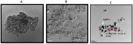 TEM images of (A) GO, (B) rGO, and (C) rGO–Ag nanocomposite. TEM images of fields were used to measure GO, rGO, and rGO–Ag particle.