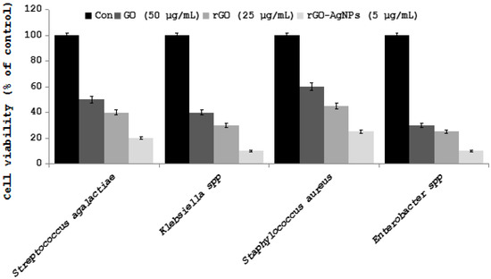 Streptococcus agalactiae, Klebsiella spp., Staphylococcus aureu, and Enterobacter spp. cells were incubated with GO (100 µg/mL) rGO (50 µg/mL), and rGO-Ag (10 µg/mL). Bacterial survival was determined at 24 h by a CFU count assay. The experiment was performed with various controls including a positive control (GO, rGO, rGO-Ag, and NB without inoculum) and a negative control (NB and inoculum without GO, rGO, and rGO-Ag). The results are expressed as the means SD of three separate experiments, each of which contained three replicates. Treated groups showed statistically significant differences from the control group according to the Student’s t-test (p < 0.05).