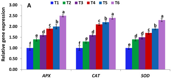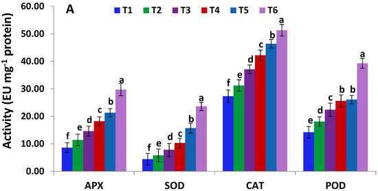 Activities of catalase (CAT), ascorbate peroxidase (APX), superoxide dismutase (SOD), and peroxidase (POD) enzymes were estimated in fresh leaves using the methodology of Zhang and Kirkham [77]. Briefly, 0.3 g of fresh tissue was homogenized in 4 mL extraction buffer containing 1% PVP, PBS (50 mM), and EDTA (0.2 mM), and then centrifuged at the highest speed at 4 °C for 8 min. The absorbance was taken at 290 nm (APX) or 240 nm (CAT) or 470 m (POD). SOD activity was also measured in fresh leaves as previously reported by Bradford [67]. Briefly, leaf tissue was homogenized in 0.2 M phosphate buffer, and centrifuged at the highest speed at 4 °C for 8 min. Supernatant absorbance was then read at 560 nm.