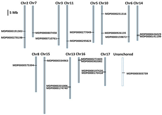 Chromosomal location of the apple MDH genes; the dashed line indicates the anchored sequences.