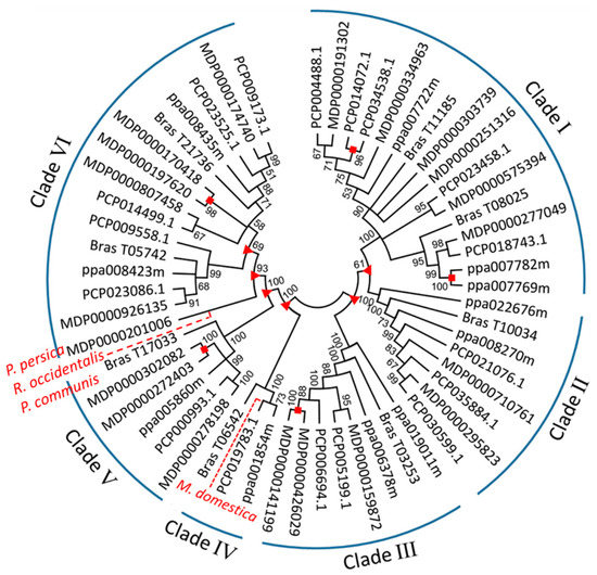 Depending on the time of occurrence, gene duplication can be divided into two types: old duplication and recent duplication [17]. If the gene duplication occurred within the species (species–species duplication), we considered a recent duplication; however, if the duplication event occurred prior to the radiation of Rosaceae species, we considered it an old duplication [18]. The signs of recent and old duplications within each MDH gene clade were detected in this study (Figure 3), and five incidences of recent duplication were identified, indicating that all the MDH genes, with the exception of five sister pairs of MDH genes, namely MDP0000426029–MDP0000141199, PCP014072.1–PCP034538.1, MDP0000302082–MDP0000272403, ppa007782m–ppa007769m, and MDP0000170418–MDP0000197620, existed before the Rosaceae species split. Furthermore, six incidences of old duplication were identified among the six tested clades, and two incidences of old duplication were identified in clade VI, indicating that the MDH gene clades underwent at least one duplication event prior to the Rosaceae species split. Recent gene loss in M. domestica, P. communis, R. occidentalis and P. persica was observed in clades IV and VI (Figure 3). However, signs of old loss of MDH genes were not detected.