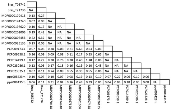 The genomic distribution of the 20 MdMDH genes is shown in Figure 2. Of these genes, 17 were identified on six homologous pairs of chromosomes (2–7, 3–11, 5–10, 6–14, 8–15 and 13–16), two were identified on chromosome 17, and one was identified among the unanchored sequences. In addition, whole-genome duplication (WGD) and segmental duplication occurred during the process of apple domestication and played an important role in the expansion of the apple gene family, as this process allows the retention of numerous duplicated genes within the apple genome [12,16]. To determine whether an MdMDH gene is under different selective pressures and exhibits evolutionary rates that differ from those of its duplicated genes, we estimated the evolutionary rates and selective pressure according to the Ka (nonsynonymous), Ks (synonymous) and Ka/Ks ratio (ω). In general, ω > 1 supports the hypothesis of positive selection, ω < 1 indicates purifying selection, and ω = 1 indicates neutral evolution. Thus, we investigated the selective pressures that act on duplicated MdMDH genes; the ω values of each duplicated gene pair are shown in Table S3. The ω value of the majority of the MdMDH gene pairs was less than 1, indicating that their evolution is under strong purifying selection. Interestingly, positive selection was detected in one pair of paralogs (MDP0000303739 and MDP0000191302), with a ratio of 1.15, and neutral selection was detected in one pair of paralogs (MDP0000807458 and MDP0000159872), with a ratio of 1.00.