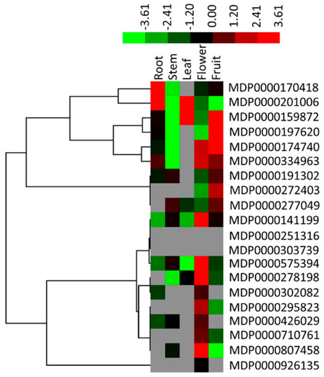 Expression profiles of MdMDHs in five tissues, including fully bloomed flowers (Flower), Root, mature leaf (Leaf), ripening fruit (Fruit) and Stem. The heat map was generated by Mev software based on relative expression levels of MdMDHs, and normalized log2 transformed values were used with hierarchical clustering. The different colors represent different expression level, with the red color representing the highest value of gene expression.