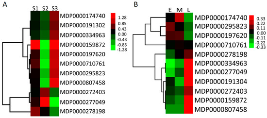 Expression level of MdMDH genes during apple fruit development (A) and flower bud differentiation (B) of apple cultivar “Qinguan”. The heat map was generated by Mev software based on RNA-seq database, and normalized log2 transformed values were used with hierarchical clustering. S1, S2 and S3 represent juvenile stage, expanding stage and mature stage of fruit development, respectively. E, M and L represent early stage, middle stage and late stage of flower bud differentiation, respectively.