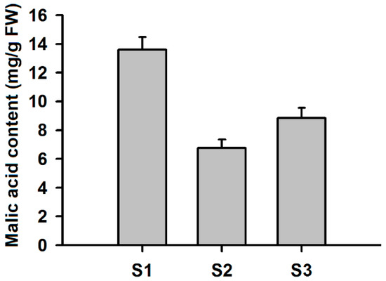Changes in malic acid concentration in fruits of apple during development. S1, S2 and S3 represent juvenile stage, expanding stage and mature stage of fruit development, respectively. FW, fresh weight.