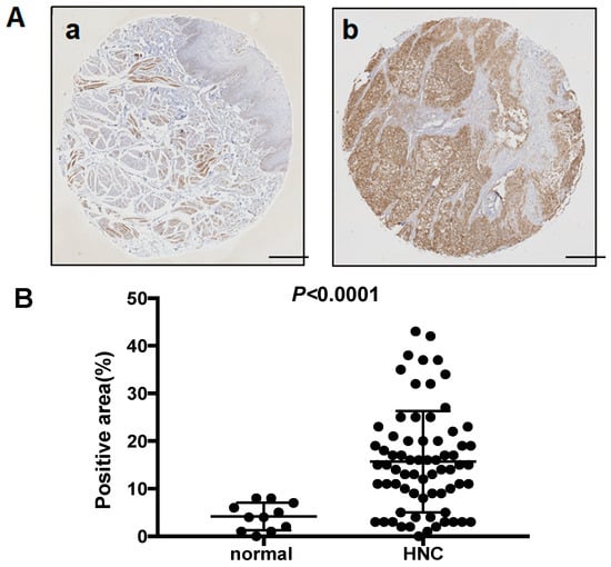 We analyzed the expression of MCT4 in head and neck cancer tissue and a normal tissue microarray (#HN803d; US Biomax, Rockville, MD, USA). The antigen was activated by cooking in a citric acid solution. For the immunohistochemical analysis, the specimens were incubated with anti-MCT4 antibody (1:100) overnight at 4 °C. The slides were then treated with a streptavidin–biotin complex (EnVision System labeled polymer, HRP; Dako, Carpinteria, CA, USA) for 60 min at a dilution of 1:100. The immunoreaction was visualized with the use of a DAB substrate–chromogen solution (Dako Cytomation Liquid DAB Substrate Chromogen System, Dako, Carpinteria, CA, USA). Quantification was performed using a BZ-X800 Analyzer hybrid cell count system (Keyence, Osaka, Japan), and the relative integrated density was calculated.