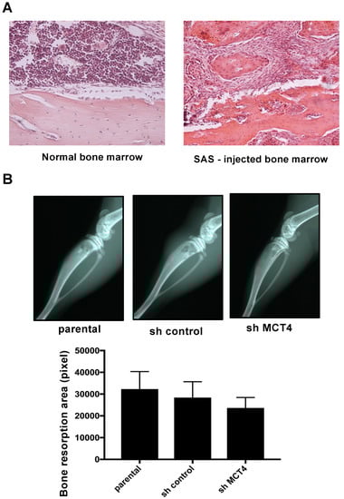 Our results showed that MCT4 reduction inhibited the lactic acid concentration in both bone marrow and HNSCC-BP. Yoneda demonstrated that an acidic micro-environment created by osteoclasts and cancer in bone induces sensory excitation and evokes bone pain [