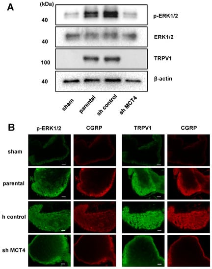 Puromycin dihydrochloride (cat. No. #sc-108071), control shRNA plasmid-A (#sc108060), MCT4 shRNA plasmid (h2) (#sc-45892-SH) and anti-MCT4 antibody (anti-rabbit, monoclonal, #sc-50329) were purchased from Santa Cruz Biotechnology (Dallas, TX). Anti-phospho-p44/42 MAPK antibody (p-ERK; anti-rabbit, monoclonal, #4370), anti-p44/42 MAPK antibody (ERK; anti-rabbit, monoclonal, #4695), horseradish peroxidase (HRP)-conjugated IgG antibody (goat anti-rabbit, monoclonal, #7074), HRP-conjugated IgG antibody (goat anti-mouse, monoclonal, #7076), Alexa Fluor 488-conjugated IgG (H+L) F(ab′)2 fragment (goat anti-rabbit, monoclonal, #4412), and Alexa Fluor 488-conjugated IgG (H+L) F(ab′)2 fragment (goat anti-mouse, monoclonal, #4408) were purchased from Cell Signaling Technology (Danvers, MA). Anti-VR1 antibody (TRPV1; anti-mouse, monoclonal, #ab203103), anti-CGRP antibody (anti-goat, polyclonal, #ab36001) and Alexa Fluor 647-conjugated IgG H&L (donkey anti-goat, monoclonal, #ab150135) were purchased from Abcam (Cambridge, MA, USA).