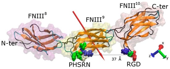 In order to bind successfully with the cell receptors, the cell-binding region must be exposed and the distance between RGD and PHSRN must remain unaffected. To establish whether the FNIII8–10 fragment maintains its integrity during the simulations, it was placed in a simulation box filled with water molecules, Na+ and Cl− ions, and a trajectory simulated for 100 ns. The root-mean-square deviation (RMSD), calculated in reference to protein structure at t = 0 ns, for each individual module remain constant throughout the simulation, confirming that the fibronectin modules maintain their structural integrity (Figure S1).