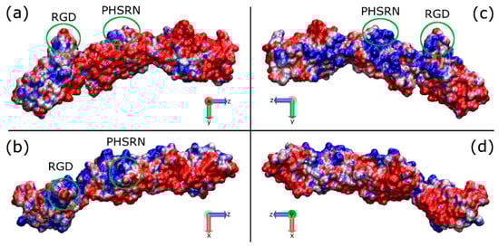 Graphical representations of the FNIII8–10 domain showing the electrostatic properties (APBS) along the long axis of the protein; (a,c) the two sides of the protein on the y-z plane, (b,d) the two sides of the protein on the x-z plane. The sides from a to d are referred to as FNa, FNb, FNc, and FNd, respectively. The areas in the green circles indicate the RGD and PHSRN sites, which are facing up in (a) and (c), pointing out from the page in (b), and into the page in (d). Red and blue indicate the negatively and positively charged domains, respectively.