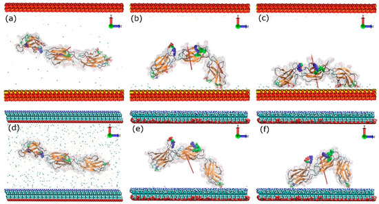 Adsorption process of FNIII8–10 on the model silica (top) and amine surface (bottom): t = 0 ns (a,d), anchoring event (b,e), end of simulation (c,f). The red arrows indicate the dipole moment of the protein, while the colour-coding is the same as that used in Figure 1. The water molecules are not shown.