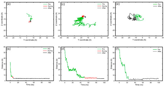 Diffusion of residues over the surface (top), and distance of residues perpendicular to the surface over time (bottom) for; anchoring residue of FNIII8 in amine system (Glu1312) (a,b), anchoring residue of FNIII10 in amine system (Thr1509) (c,d); and anchoring residue of FNIII10 in silica system (Thr1509) (e,f). Green, red, and black respectively illustrate the trajectories before, during, and after anchoring.