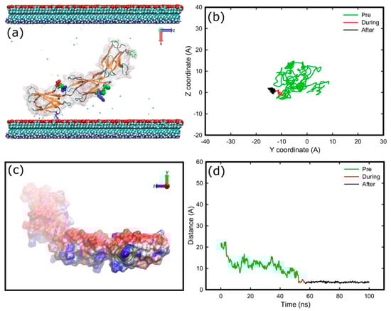 Adsorption of FNIII8–10 onto carboxyl surface; (a) snapshot at the end of simulation, (b) diffusion of the anchoring residue over the surface, (c) electrostatic representations (APBS) of the FNIII8–10 fragment as viewed from the carboxyl surface on the final stage of adsorption, and (d) distance of the anchoring residue perpendicular to the surface over time. The areas inside the green circles indicate the areas that are in contact with the surface. The deep cueing option of VMD is being used to indicate the distance of each atom from the surface. The colour-coding is the same as previously, while surface atoms and water molecules are not shown for sake of clarity.