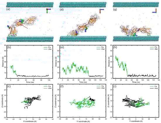 Adsorption of FNIII8-10 on methyl surfaces in three different orientations; (a–c) “head-on”; (d–f) “beta-on”; and (g–i) “side-on”. (a,d,g) Snapshots at the end of simulation, (b,e,h) distance of the anchoring residues perpendicular to the surfaces over time, (c,f,i) diffusion of the anchoring residues over the surface. The colour-coding is the same as Figure 1.