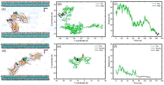 Adsorption of FNIII8–10 on hydroxyl surfaces on two different systems; (a–c) methyl-hydroxyl, (d–f) hydroxyl-hydroxyl. (a,d) Snapshots at the end of simulation, (b,e) diffusion of the anchoring residues over the surface, (c,f) distance of the anchoring residues perpendicular to the surfaces over time. The colour-coding is the same as Figure 1.