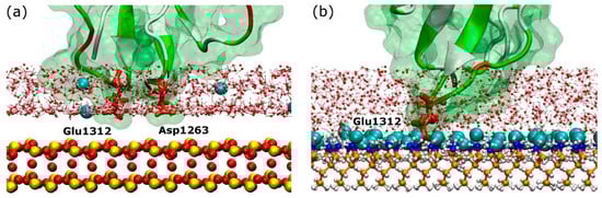 The rapid and directed adsorption on the positively charged surfaces, unlike that on the negative carboxyl-terminated surface, is due to the negatively charged fragment being steered by the electric field. After anchoring on the model, rigid silica surface, the fragment maintains some mobility across the surface (Figure 4). In contrast, the anchoring residues were immobilised upon adsorption on amine-terminated surface. It is very likely that differences in adsorption characteristics are due to the rigidity of the substrate. Unlike the atoms that are fixed in space on the silica surface, the molecules that compose the amine surface possess a certain degree of flexibility because only the first few carbon atoms next to the underlying substrate are fixed in space. As a result, the amine surface can be considered as a “soft” surface that allows the anchoring residues to penetrate the SAMs molecules, create more bonds and, consequently, inhibit their surface movement. The explanation is supported by detailed snapshots of the negatively charged anchoring residues on the two surfaces discussed, as shown in Figure 8. The model silica surface atoms are densely packed and fixed in space, therefore, anchoring residues and ions appear at well-defined distances from the surface as determined by van der Waals radii of surface atoms. The “empty” space above silica surface in Figure 8a actually represents the van der Waals volume of surface atoms, but is not shown for clarity’s sake. In contrast, due to flexibility of the SAM molecules (and especially the terminal groups), the large free volume available at the surface allows ions, water, and anchoring residue(s) to penetrate the surface. Strong anchor–SAM surface interactions immobilise the anchor (and entire fragment).