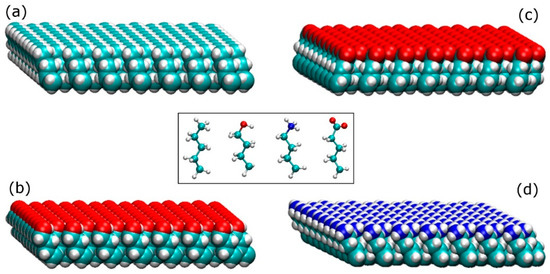 Self-assembled monolayers (SAMs)-replicating model surfaces; (a) methyl-terminated (−CH3), (b) hydroxyl-terminated (−OH), (c) carboxyl-terminated (−COO−), and (d) amine-terminated (−NH3+). On the inset are shown the building molecules for the SAM replicated model surfaces (from left to right; methyl-terminated, hydroxyl-terminated, amine-terminated, and carboxyl-terminated).
