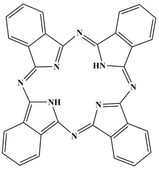 Phthalocyanine (PC) and its derivatives are a class of synthetic compounds that are closely linked to natural porphyrins. They have many uses as pigments and dyes [1,2]. PC has a planar and symmetric structure, with a high level of conjugation, as shown in Figure 1, which gives it a stable and intense blue color. PC derivatives can also improve the performance of semiconductors [3]. Based on these features, PC is extensively used in the fields of medicine, photonics, electronics, and energy conversion [4,5].