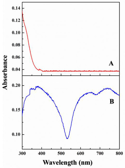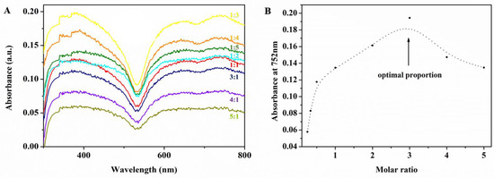 CUR by itself absorbed in the UV range only, as shown in Figure 2A. PC is not water soluble, but electron spectroscopy showed that it had two absorption bands: The B band (typically between 250 and 350 nm) and the Q band (typically between 600 and 700 nm; data not shown) [10,37]. The electron spectra of PC derivatives were similar. The B and Q absorption bands were caused by π-electron transitions on the PC ligand ring. In the composite CUR-PC—which was water-soluble, as shown in Figure 2B—the B and Q bands were broadened. CUR-PC also had a new absorption peak at 752 nm, the result of a redshift in the Q band. Figure 3A shows the absorption spectra of different CUR:PC molar ratios, starting from a weak 1:5 ratio to a strong 5:1 ratio. As the molar ratio increased, absorption in the B and Q bands first increased and then, at a molar ratio of 3:1, began to decrease. This is also shown by the absorbance at 752 nm, which peaked at a molar ratio of 3:1, as shown in Figure 3B.
