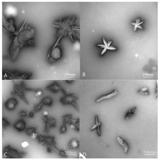A droplet of the solution was put onto a carbon support film, on a copper grid. Excess was removed after 5–10 min, with filter paper. A droplet of 1% (w/v) phosphotungstic acid was put onto the grid and removed with a filter paper, after 5–10 min. After drying at room temperature, the grid was observed, using a TEM device (JEM-1200EX, JEOL Ltd., Tokyo, Japan), at a voltage of 100 kV.