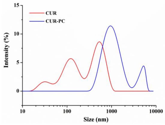 Freeze-dried, renatured CUR and freeze-dried CUR-PC were weighed and separately dissolved in water, at a concentration of 1 mg/mL. The effective particle size was determined by dynamic light scattering technology (DLS), using a Zeta-sizer Nano ZS90 (Malvern Instruments Ltd., Malvern, UK), at 25 °C.