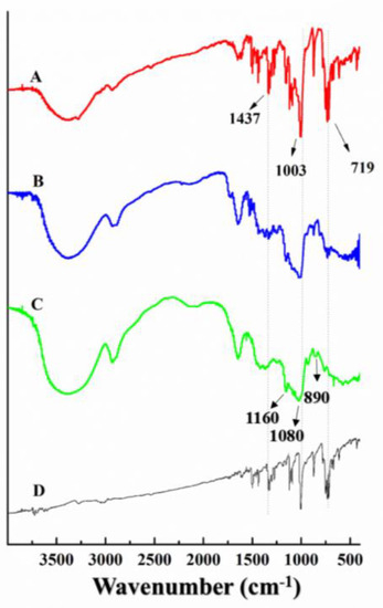The loading of PC into CUR was examined by FTIR. The characteristic infrared absorption spectrum of CUR had peaks corresponding to β-(1,3) glucan linkages at 890, 1080, and 1160 cm−1, as shown in Figure 6, spectrum C. The PC spectrum (spectrum D) had characteristic peaks at 719, 1003, and 1437 cm−1, which were attributed to the C–H, out-of-plane bending vibration peak. Peaks at 1568 and 1584 cm−1 were attributed to benzene ring C–C stretching. A peak at 1428 cm−1 was attributed to benzene ring stretching, as well as C–H and N–H in-plane bending. The carbon-nitrogen-conjugated double bond was considered a functional group of PC. The spectrum of a physical mixture of PC and CUR (i.e., not the CUR-PC complex) had characteristic PC peaks at 719, 1003, and 1437 cm−1 (spectrum A), along with other peaks related to CUR (spectrum C). However, these peaks were not observed in the CUR-PC spectrum (spectrum B), which suggested that the PC was encapsulated by nanoparticles. Moreover, the peaks presented in the physical mixture were not present in the CUR-PC spectrum, which showed that the nanoparticles formed through an interaction between PC and CUR.