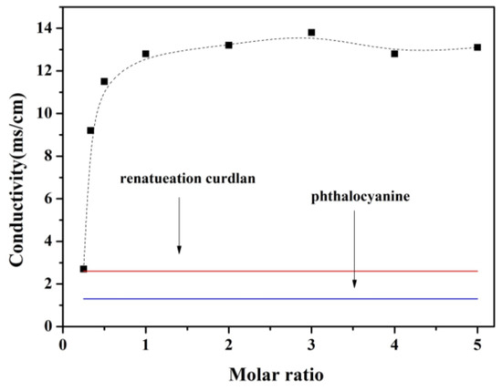 At low volume ratios (≤1), the conductivity of CUR-PC solutions increased dramatically with increasing volume ratio, reaching a plateau at a volume ratio of 1, as shown in Figure 7. For comparison, ultrasonically dispersed PC in water (1 mg/mL) had a conductivity of 1.3 μSiemens/cm (μS/cm)—as shown by the blue line in Figure 7—and the conductivity of renatured CUR was 2.6 μS/cm, the red line in Figure 7. Thus, the CUR-PC complex had a much higher conductivity than its individual components.