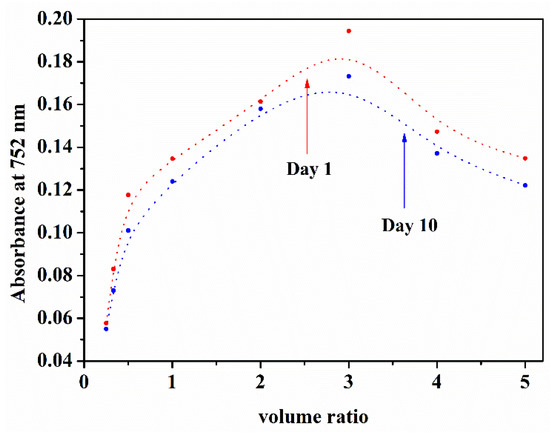 Absorbance at 752 nm of different volume ratios (CUR/PC).