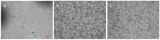 Microscopy images of HeLa cells: Control group (a), cultured with CUR-PC (b), and cultured with CUR-PC, then exposed to long-wavelength light irradiation (c). Scale bar = 100 μm.