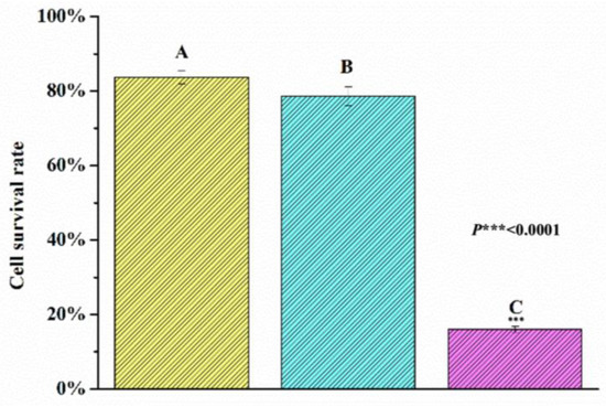 Cell survival rate of the HeLa cells treated with long-wavelength light irradiation: Control group (A), cultured with CUR-PC (B), and cultured with CUR-PC, then exposed to long-wavelength light irradiation (C).