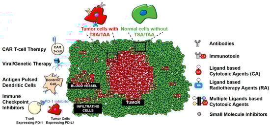 IL-13RA2 targeting agents are represented by IL-13-based fusion/conjugated proteins (e.g., to bacterial toxins), nanoparticles and liposomes, viruses, IL-13 conjugated radiotherapy agents, antibodies (e.g., conjugated to cytotoxic drugs, and unconjugated), peptide pulsed dendritic cells or receptor peptides, and CAR T-cells against IL-13RA2. These can be broadly categorized as types of active, passive, or adoptive immunotherapy. Active immunotherapy entails the arming of immune system to initiate long-term memory by allowing the immune system to fight tumor cells long after the administration of the therapy [,]. Passive immunotherapy on the other hand, is the administration of immunotherapeutic agents that are based on the elements of the immune system, temporary, but still could instill a long term memory under certain conditions []. Adoptive immunotherapy or adoptive cell transfer (ACT) involves the isolation of T-cells from patients. These T-cells are genetically modified to express TSA or TAA protein-binding moieties. Chemotherapy can then be administered to weaken the existing tumor environment. Finally, the genetically modified T-cells are introduced into a patient so that the engineered T-cells can selectively home and destroy the tumor cells of interest by recognizing TSA/TAA [].