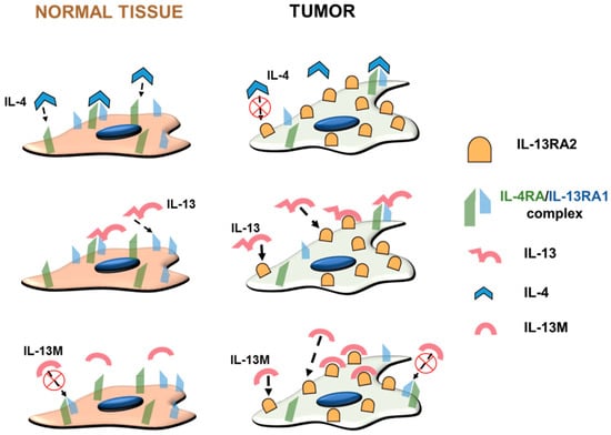 A schematic of the IL-13 receptor system. Normal and tumor cells express IL-4RA/IL-13RA1. IL-4RA/IL-13RA1 have IL-4RA (represented in green) and IL-13RA1 (represented in blue) subunits. IL-4 first binds to IL-4RA, then to the IL-13RA1 to form an IL-4RA/IL-13RA1 complex. IL-13 first binds to IL-13RA1, then to IL-4A to form an IL-4RA/IL-13RA1 complex in normal tissue. On the other hand, IL-13RA2 is expressed by tumor cells. IL-4 binds to IL-4RA/IL-13RA1, but not to IL-13RA2 (represented by a red encircled cross). IL-13 binds to both IL-4RA/IL-13RA1 and IL-13RA2. IL-13 binds more readily to IL-13RA2 compared to IL-4RA/IL-13RA1. By introducing mutation in the IL-13 ligand to produce IL-13M, the ligand binds mostly only to the IL-13RA2, and not to IL-4RA/IL-13RA1 complex (represented by a red encircled cross).