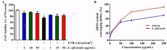 Effect of E. officinalis on cell viability and ABTS (2,2′-azino-bis (3-ethylbenzothiazoline-6-sulfonic acid)) radical scavenging ability. (A) Cell viability after 72 h with or without ultraviolet B (UVB) (144 mJ/cm2) and E. officinalis (1 µg/mL, 10 µg/mL, or 50 μg/mL); (B) ABTS radical scavenging ability of E. officinalis. Arbutin was used as a positive control. Values are means ± standard deviation (SD). * and # indicate significant differences between the non-irradiated control and the UVB-irradiated control, respectively. * p < 0.05 versus the non-irradiated control.