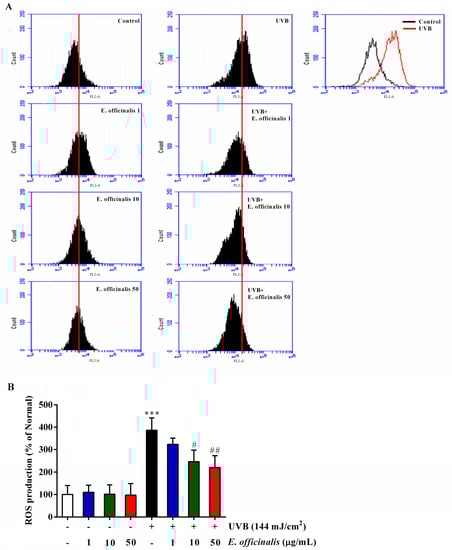Effect of E. officinalis on the generation of reactive oxygen species (ROS) in UVB-irradiated normal human dermal fibroblasts (NHDFs). (A) ROS levels in NHDFs were determined after 24 h of UVB radiation with and without E. officinalis treatment. The number of cells is plotted versus the dichlorofluorescein fluorescence detected by the FL-2 channel; (B) The relative ROS generated by NHDFs is shown. Values are means ± SD. *** p < 0.001 versus the non-irradiated control. # p < 0.05 and ## p < 0.01 versus the UVB-irradiated control.