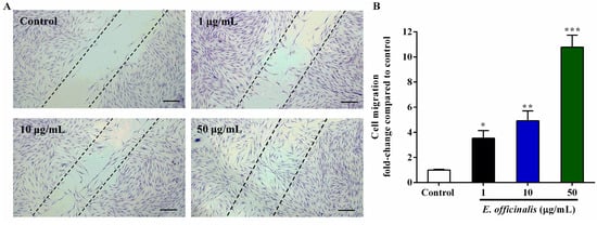 Effect of E. officinalis on NHDF cell migration as determined by a wound-healing assay. (A) NHDF cells cultured for 72 h were fixed and stained with crystal violet. The dotted lines represent the wound boundary of Control. Magnification scale: 100×. Scale bar: 200 µm; (B) Graphical presentation of wound-healing assay. Values are means ± SD. * p < 0.05, ** p < 0.01, and *** p < 0.001 versus the untreated control.