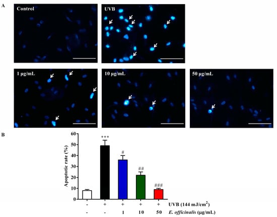 Anti-apoptotic effect of E. officinalis on UVB-irradiated NHDFs. (A) Apoptotic cells were detected by Hoechst 33258 staining. Cells that underwent apoptosis are indicated by arrows. Magnification scale: 400×. Scale bar: 10 µm; (B) Apoptotic rate was calculated as a percentage of apoptotic cells over the total number of cells numbers in five randomly selected areas. Values are means ± SD. *** p < 0.001 versus the non-irradiated control. # p < 0.05, and ## p < 0.01, and ### p < 0.001 versus the UVB-irradiated control.
