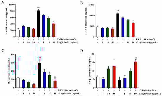 The MMPs are a family of calcium-dependent, zinc-containing endopeptidases that can degrade all kinds of proteins in the ECM. After UVB irradiation, the secretion of MMP-1 and MMP-3 increased to 287.1% and 134.5% of that found in normal NHDF cells, respectively (Figure 5A,B). Treatment with 50 μg/mL of E. officinalis extract after exposure to UVB suppressed the expression of MMP-1 and MMP-3 by 49.9% and 41.1%, respectively. UVB irradiation also induced a 148.0% increase in the pro-inflammatory cytokine IL-6. Interestingly, E. officinalis treatment significantly inhibited that elevation, by 72.3% at 50 μg/mL (Figure 5C).